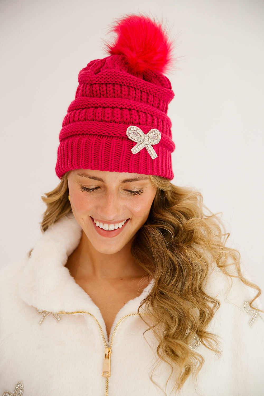 Stay stylish and warm this bow season with our cream or pink sherpa hats adorned with playful silver beaded bow patches. For a fun and cozy look, grab our red, cream, or pink beanies with puff balls and silver beaded bows. Who says hunting can't be fashionable? (No seriously, who says that?)