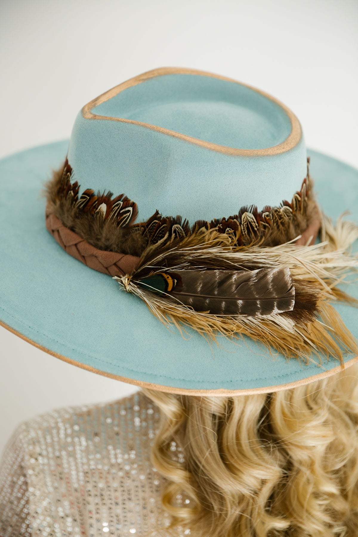Stand out with the Frost & Feather Rancher Hat in a unique light blue shade. This one-of-a-kind hat features delicate feathering details and an adjustable fit, combining style and comfort effortlessly. Perfect for adding a fresh, distinctive touch to any outfit.